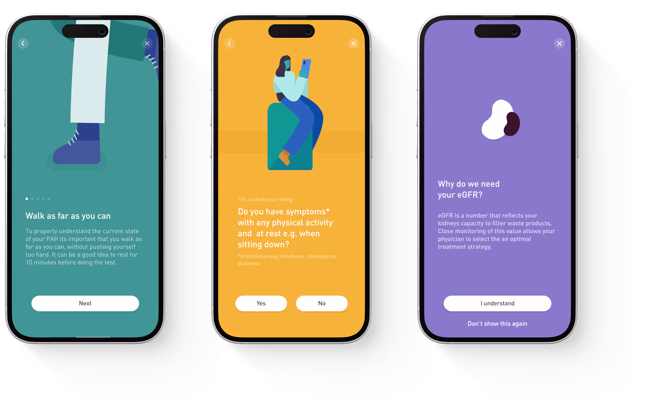 The app was developed to know what to capture and could lean on an objective method to formulate a patient´s status. Part of the conceptualized purpose of the app was for it to collect data points from a variety of connected devices, and with a GPS-based tracking test, the disease specific 6-minute walk test could be done remotely. We knew that most patients already kept a physical notebook where they logged a symptom diary to remember important information and keep track of any trends in their symptoms when visiting their clinician.